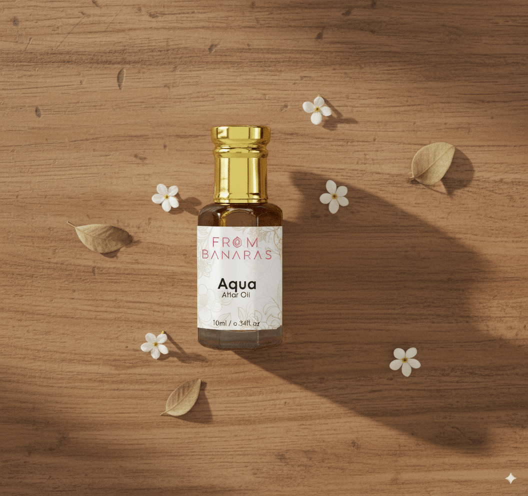 Experience the crisp and soothing aroma of Aqua Attar from Banaras. 100% natural, alcohol-free, and long-lasting. Perfect for daily wear, rituals, and meditation.